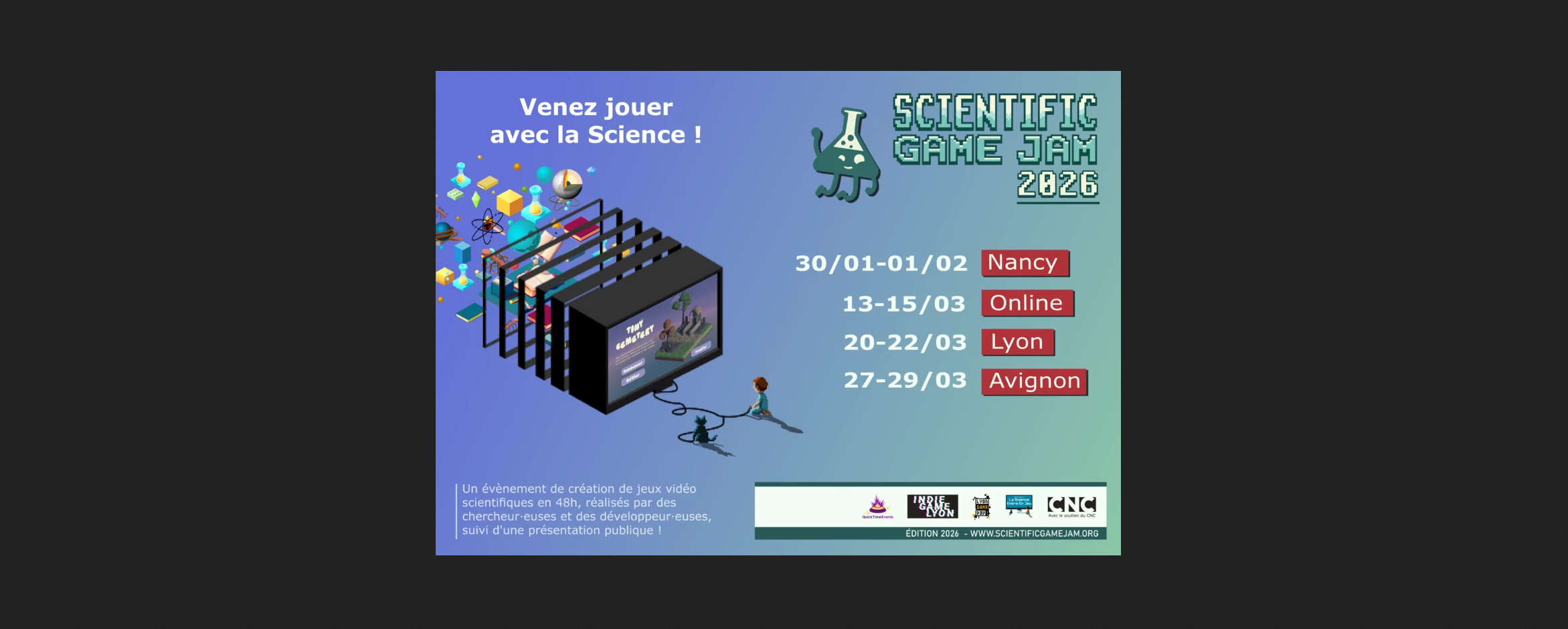 La Scientific Game Jam, est un évènement de création de jeux vidéo scientifiques, ayant lieu dans plusieurs villes françaises et canadiennes, au mois de mars et avril 2026.